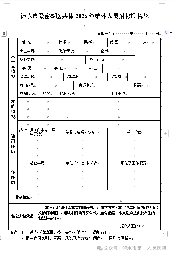 2.瀘水市緊密型醫(yī)共體2026年編外人員招聘報(bào)名表