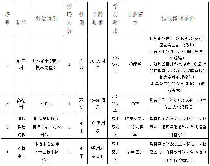 一、此次面向社會(huì)公開(kāi)招聘婦產(chǎn)科兒科護(hù)士1名、藥劑科藥劑師1名、眼耳鼻咽喉科眼耳鼻咽喉科醫(yī)師1名、體檢中心體檢中心醫(yī)師1名,共計(jì)4人。(性別不限)