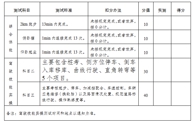 每個(gè)科目實(shí)行量化評(píng)分,并對(duì)個(gè)人綜合得分進(jìn)行量化排名,體能科目得分低于20分的或者總分低于80分,體能技能測(cè)試計(jì)為不合格。
