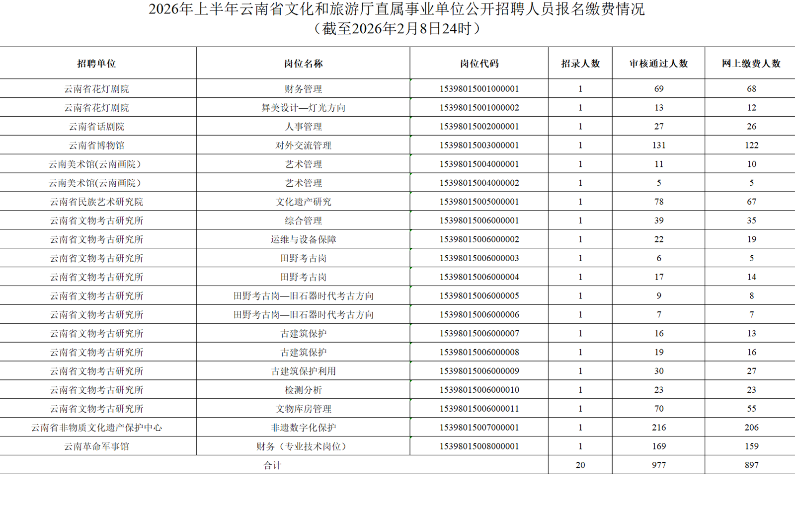 2026年上半年云南省文化和旅游廳直屬事業(yè)單位公開招聘人員報名繳費情況