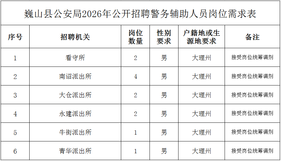 此次招聘警務(wù)輔助人員12人,崗位為:巍山縣公安局基層所隊(duì)非涉密崗位,詳見《巍山縣公安局2026年公開招聘警務(wù)輔助人員崗位需求表》。