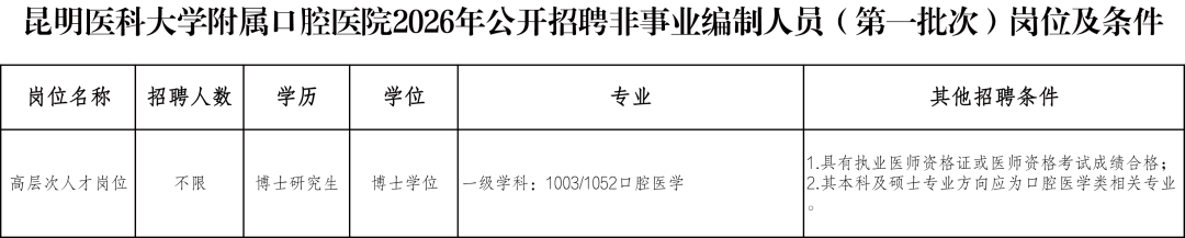 昆明醫(yī)科大學(xué)口腔醫(yī)學(xué)院暨附屬口腔醫(yī)院(云南省口腔醫(yī)院)是集醫(yī)療、教學(xué)、科研、社會(huì)服務(wù)為一體的省級(jí)口腔??漆t(yī)院,因業(yè)務(wù)發(fā)展需要,面向社會(huì)公開招聘工作人員,現(xiàn)將有關(guān)事項(xiàng)公告如下: