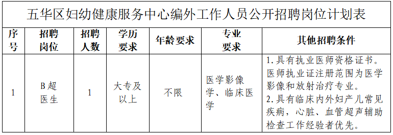 為進(jìn)一步滿足五華區(qū)婦幼健康服務(wù)中心工作開展需要,按照公開、平等、競爭、擇優(yōu)的原則,委托云南潤邦人力資源服務(wù)有限公司(以下簡稱公司),面向社會公開招聘B超醫(yī)生1名,現(xiàn)將招聘有關(guān)事項公告如下: