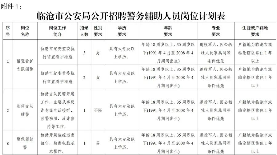 本次共招聘7人,具體招聘計劃詳見《臨滄市公安局公開招聘警務(wù)輔助人員崗位計劃表》(見附件1)。