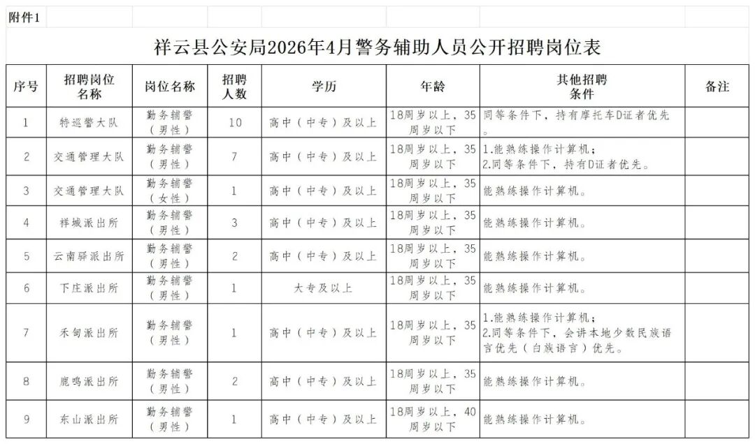 1.祥云縣公安局2026年4月警務(wù)輔助人員公開(kāi)招聘崗位表
