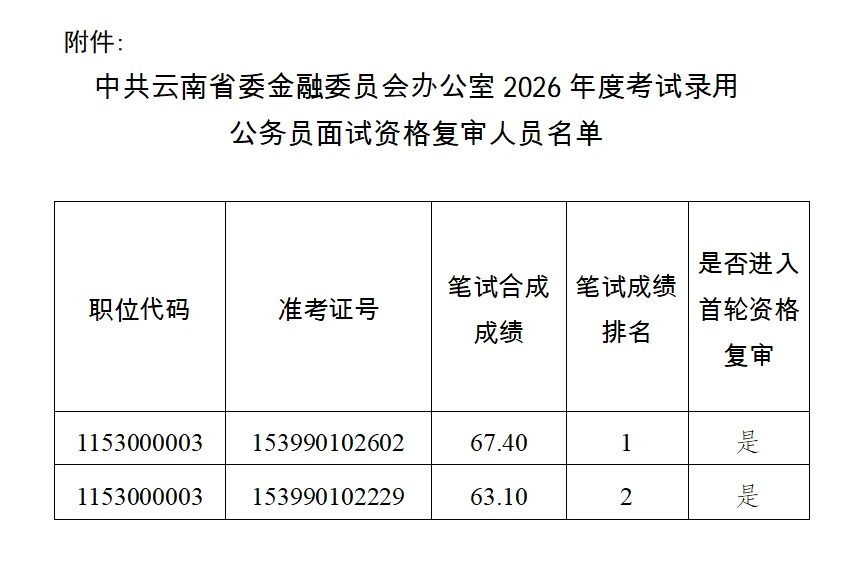 附件:中共云南省委金融委員會(huì)辦公室2026年度考試錄用公務(wù)員面試資格復(fù)審人員名單