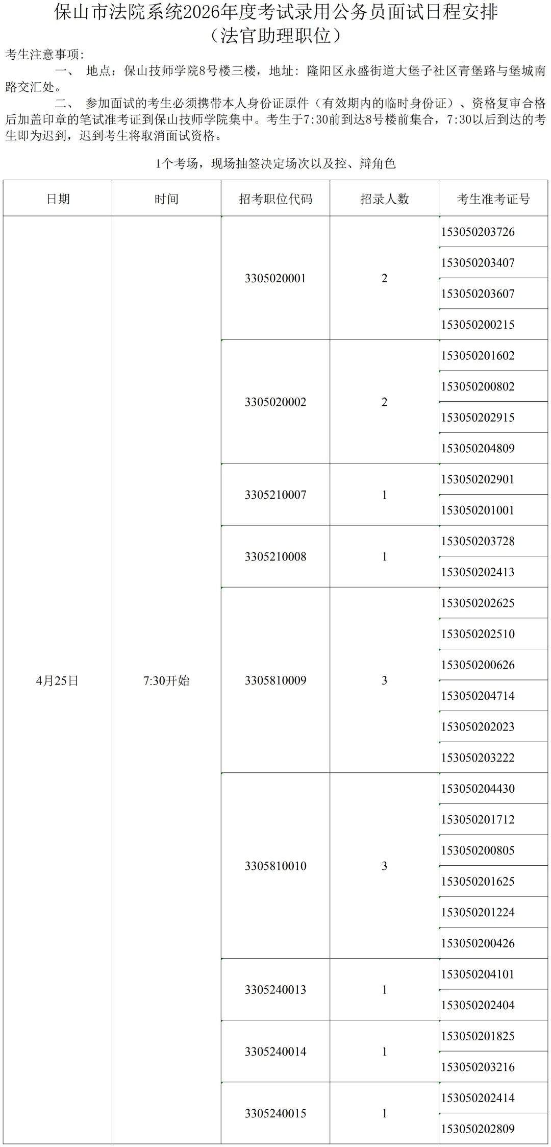 附件:保山市法院系統(tǒng)2026年度考試錄用公務(wù)員面試日程安排(法官助理職位)
