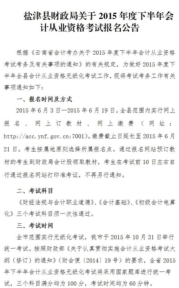 鹽津縣2015年度下半年會(huì)計(jì)從業(yè)資格考試報(bào)名公告