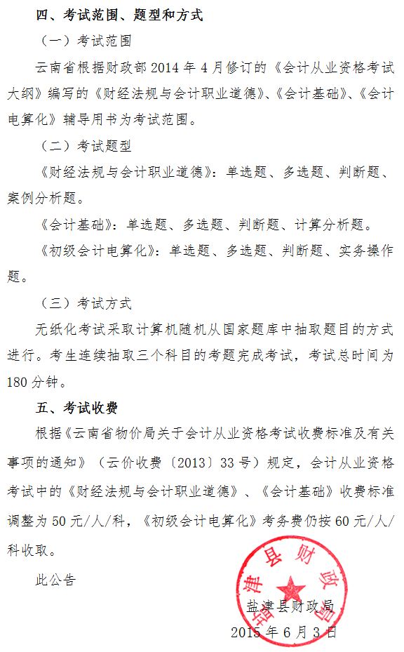 大理州巍山縣2015年度下半年會(huì)計(jì)從業(yè)資格考試公告