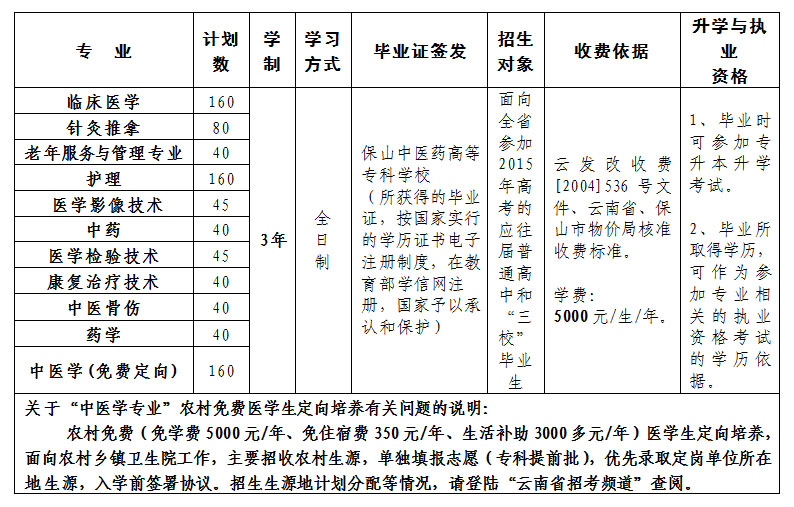 保山中醫(yī)專2015年招生專業(yè)及計劃數(shù)