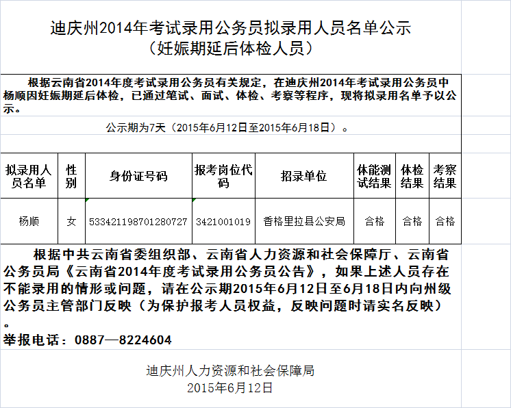 迪慶州2014年考試錄用公務(wù)員擬錄用人員名單公示(延后體檢)