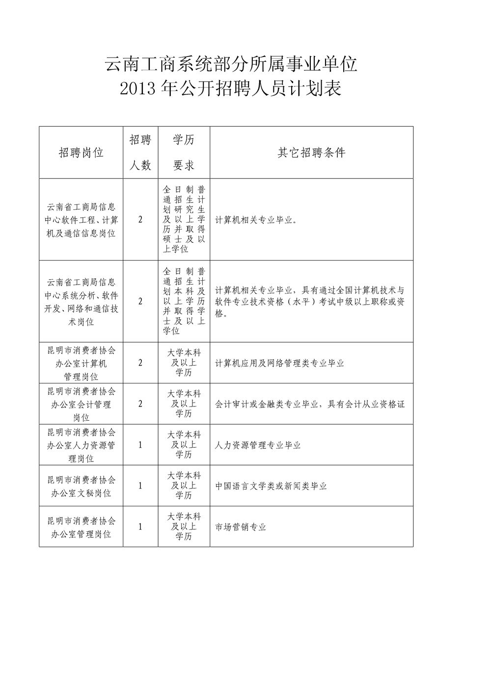詳見《云南工商系統(tǒng)部分所屬事業(yè)單位2013年公開招聘人員計劃表》