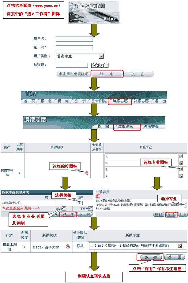 在填報截止時間之前,考生登錄工作網(wǎng)(www.ynzs.cn或www.ynzk.cn),自行進(jìn)行志愿填報;在確認(rèn)截止時間之前,考生攜帶準(zhǔn)考證到確認(rèn)點進(jìn)行確認(rèn)、簽字,完成志愿填報。