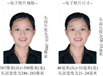 2.圖像規(guī)格:567像素(高)× 390像素(寬),頭部寬度為248~283像素,頭部長(zhǎng)度為331~390像素,分辨率300dpi,圖像文件大小在20~200 kB,JPG格式。圖像尺寸為48毫米(高)× 33毫米(寬),頭部長(zhǎng)度為28~33毫米,頭部寬度為21~24毫米。