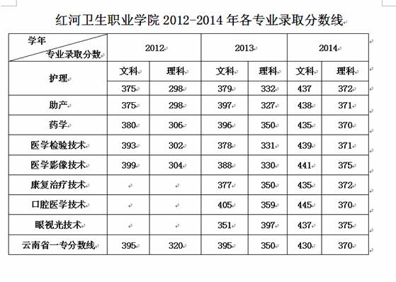 紅河衛(wèi)生職業(yè)學院2012-2014年各專業(yè)錄取最低分數線