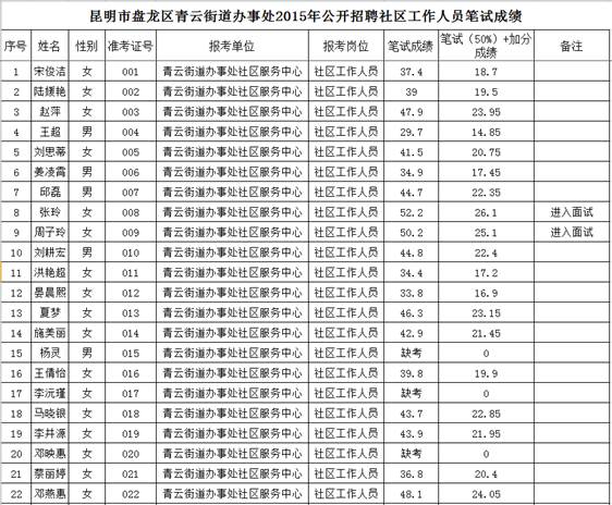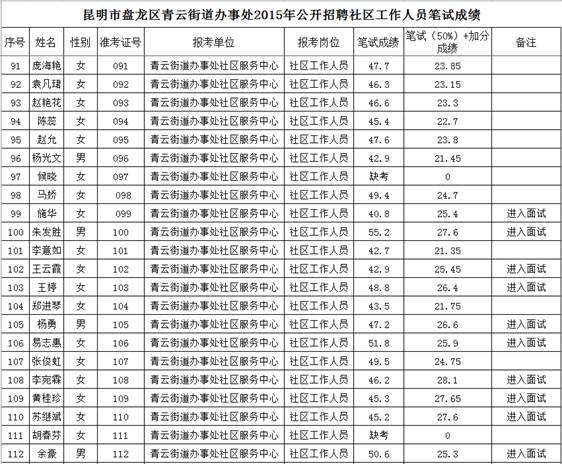 按照盤龍區(qū)青云街道辦事處2015年公開招聘社區(qū)工作人員公告安排現(xiàn)將筆試成績予以公示,并將注意事項(xiàng)及下一步工作安排說明如下: