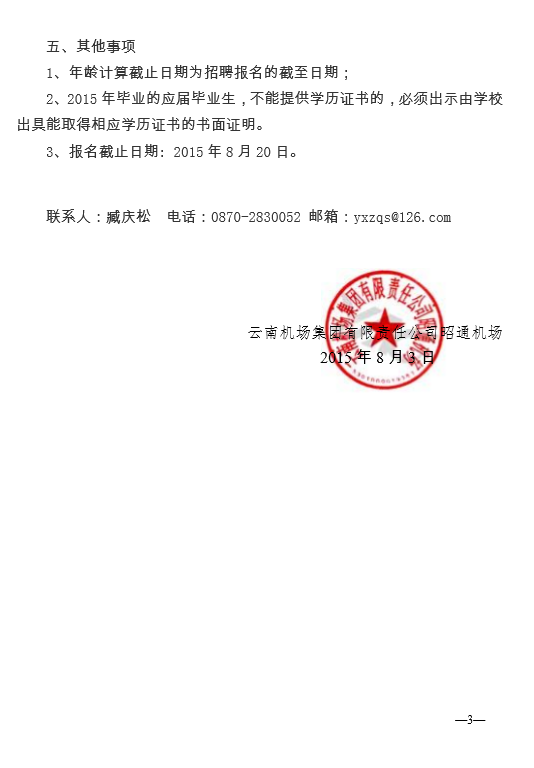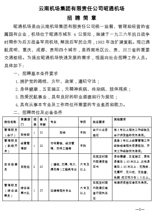 云南機(jī)場集團(tuán)有限責(zé)任公司昭通機(jī)場2015年招聘簡章