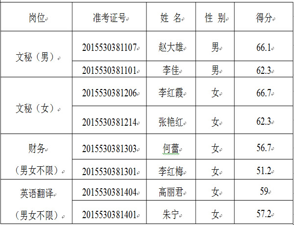 根據(jù)《宣威市招商合作局公開選調工作人員實施方案》,本次公開考試選調崗位分別為:文秘崗位,選調2人(男女各1名);財務崗位,選調1人(男女不限);英語翻譯崗位,選調1人(男女不限);企業(yè)服務和招商引資崗位,選調4人(男女各2名),本崗位因報名人數(shù)未能達到開考比例被取消。按照筆試成績從高分到低分的順序,分崗位、分男女比例分別按照1:2的比例確定各個崗位的面試人員的規(guī)定,現(xiàn)將宣威市招商合作局公開選調工作人員進入面試人員名單公告如下。