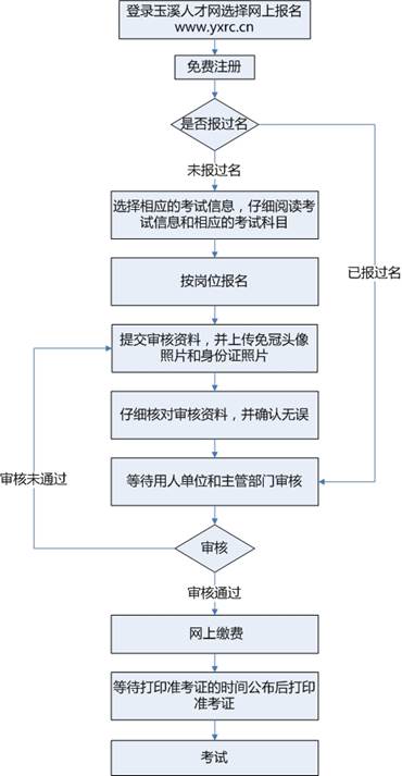 網(wǎng)絡(luò)報(bào)名的大致流程為:登錄玉溪人才網(wǎng)→網(wǎng)上報(bào)名入口→注冊(cè)→查看招聘崗位→按崗位報(bào)名并填寫報(bào)名資料→等待審核→審核通過→網(wǎng)上交費(fèi)(注意查看交費(fèi)狀態(tài),確認(rèn)交費(fèi)成功)→打印筆試準(zhǔn)考證(打印時(shí)間在筆試公告內(nèi)另行通知)→參加筆試。