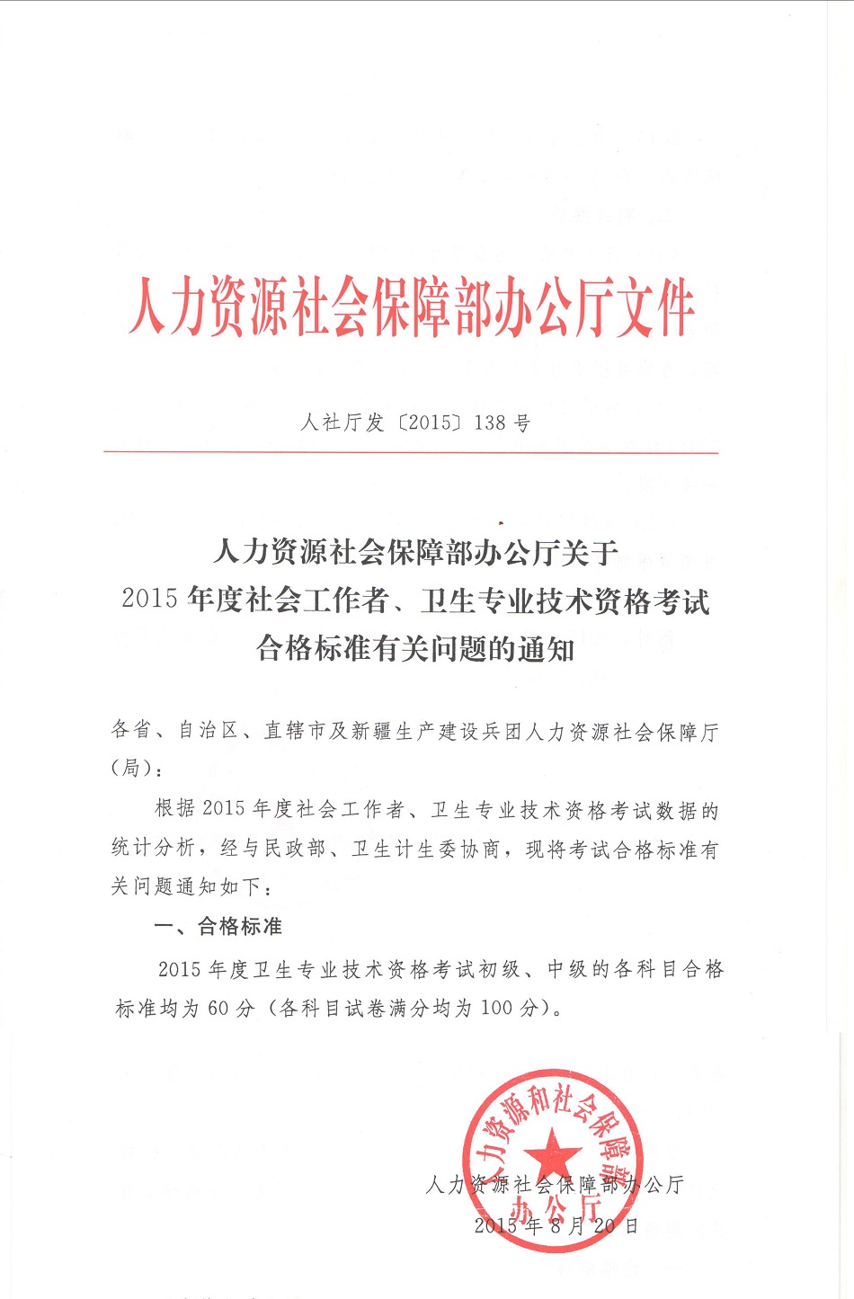 2015年度衛(wèi)生專業(yè)技術(shù)資格考試合格標(biāo)準(zhǔn)有關(guān)問題的通知