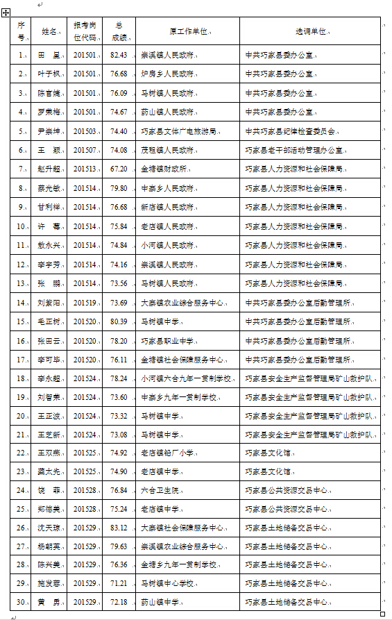 根據(jù)《中共巧家縣委組織部巧家縣人力資源和社會保障局關(guān)于印發(fā)巧家縣縣直機關(guān)事業(yè)單位公開選調(diào)工作人員實施辦法的通知》(巧組聯(lián)發(fā)〔2015〕6號)精神,經(jīng)過筆試、面試、經(jīng)歷業(yè)績評價、考核考察,現(xiàn)將擬選調(diào)人員名單公示如下: