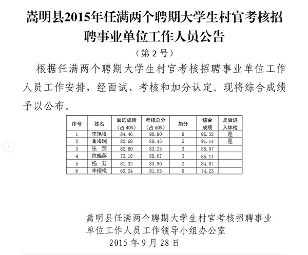 嵩明縣2015年任滿兩個(gè)聘期村官招聘事業(yè)單位人員綜合成績(jī)公告