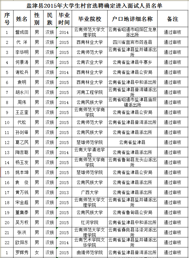 附件:鹽津縣2015年大學(xué)生村官選聘確定進(jìn)入面試人員名單