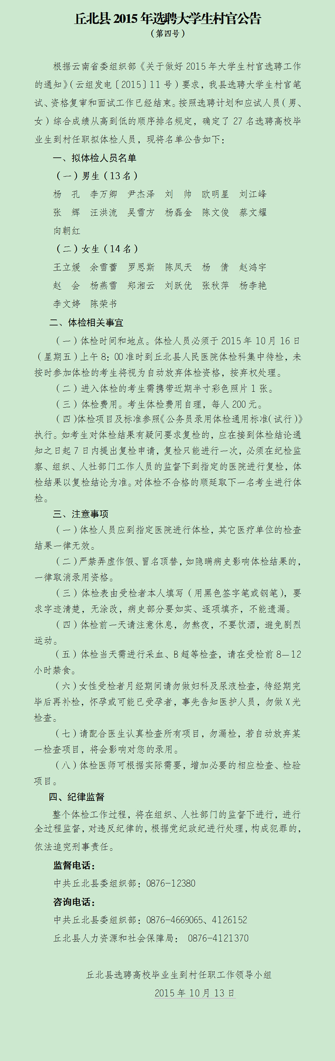 丘北縣2015年選聘大學(xué)生村官公告(第四號(hào))