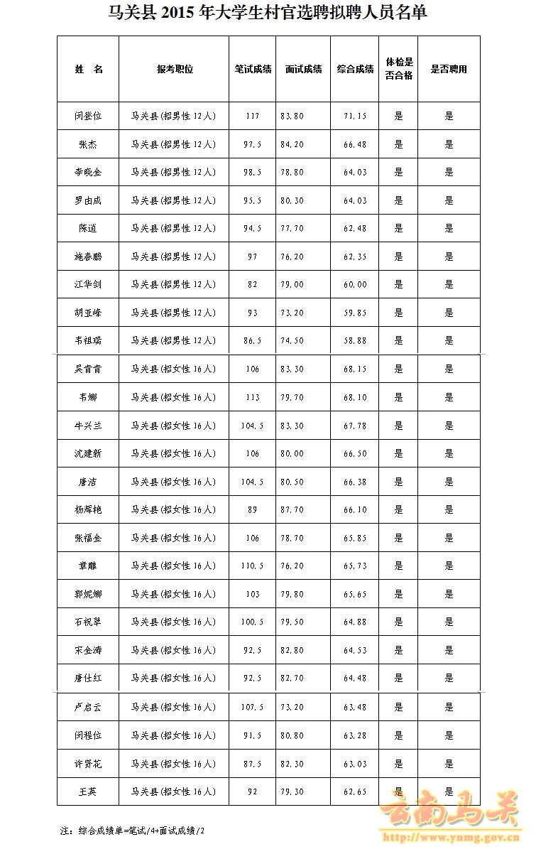 根據(jù)《云南省2015年大學(xué)生村官選聘公告》、省委組織部《關(guān)于做好2015年大學(xué)生村官選聘的工作的通知》(云組發(fā)電〔2015〕11號)、《關(guān)于做好2015年大學(xué)生村官選聘面試工作的通知》及中共文山州委組織部《關(guān)于做好大學(xué)生村官選聘有關(guān)工作的通知》要求,馬關(guān)縣2015年選聘大學(xué)生村官資格復(fù)審、面試、體檢工作已經(jīng)結(jié)束。現(xiàn)將馬關(guān)縣2015年大學(xué)生村官擬聘人員予以公示(附表)。