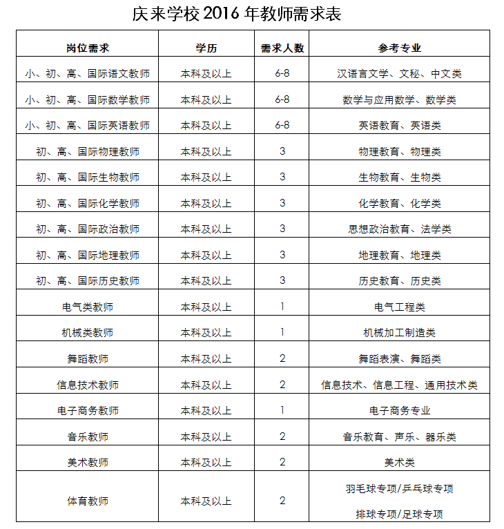 真誠地期待熱愛教育事業(yè)的您加入我們!更多信息請登陸慶來學(xué)校網(wǎng)站:http://www.qlschool.com.cn