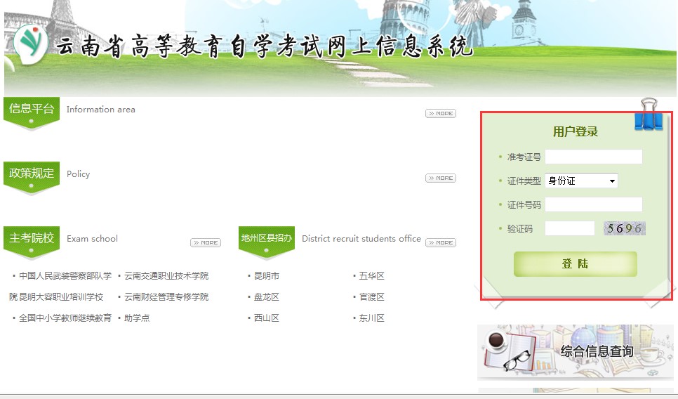 考生進入“云南省高等教育自學考試網上信息系統”,通過準考證號+證件號碼+驗證碼的方式驗證登錄。登錄界面如圖1-1所示: