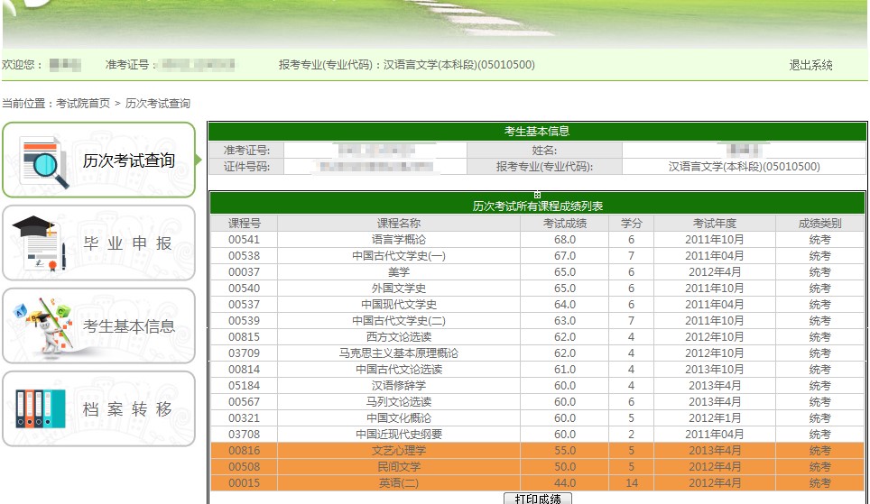 功能如下:查看考生基本信息、查看歷次考試成績、畢業(yè)申報、檔案轉移等。