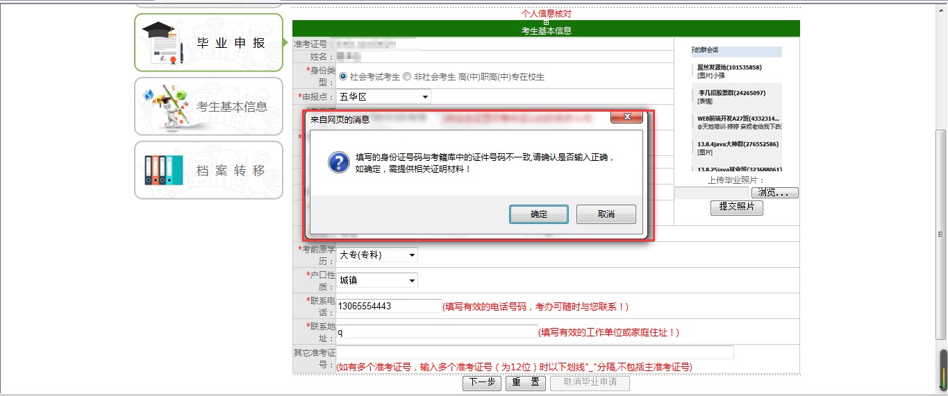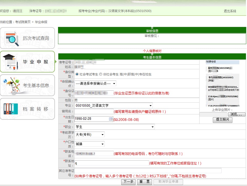 申報確定未確認考生信息前,考生可以取消畢業(yè)申請,在考生基本信息界面點擊“取消畢業(yè)申請”按鈕。如圖4-1所示: