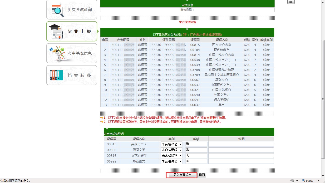 在考生成績顯示界面(如圖3-2)上,點擊“提交申請資料”按鈕,完成畢業(yè)申請?zhí)峤弧?/p>