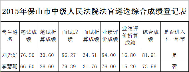 2015年保山市中級人民法院法官遴選綜合成績