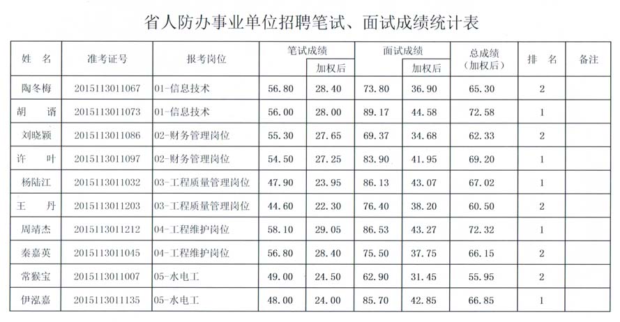 云南省人防辦2015年事業(yè)單位招聘筆試、面試成績(jī)統(tǒng)計(jì)表