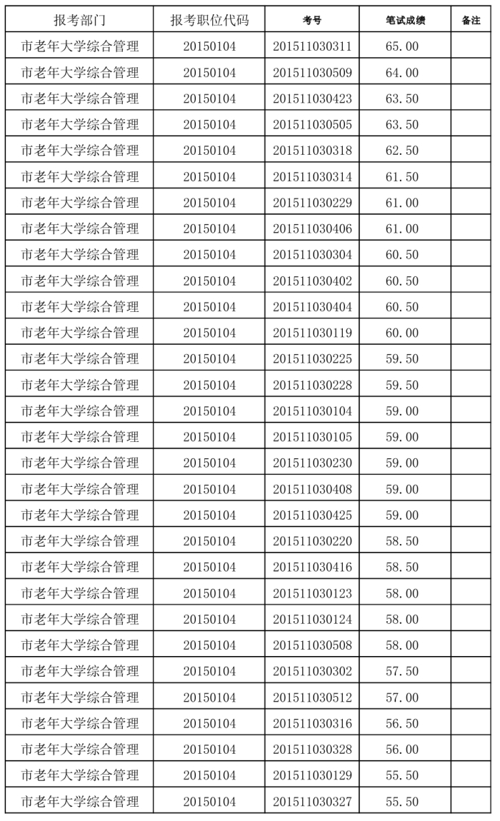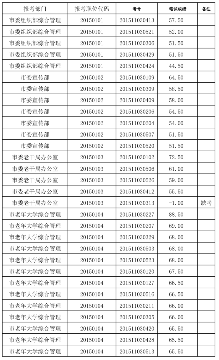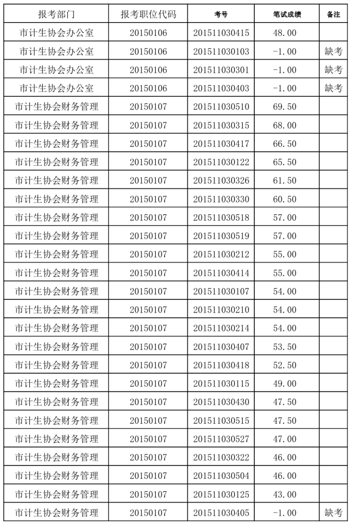 昭通市2015年市直機(jī)關(guān)公開遴選公務(wù)員公告 (第二號) 根據(jù)《昭通市2015年市直機(jī)關(guān)公開遴選公務(wù)員公告》(第一號)的有關(guān)要求,昭通市2015年市直機(jī)關(guān)公開遴選公務(wù)員已于2015年11月28日上午9:00—11:00在昭通市財校完成筆試相關(guān)工作,現(xiàn)將筆試成績公告如下: