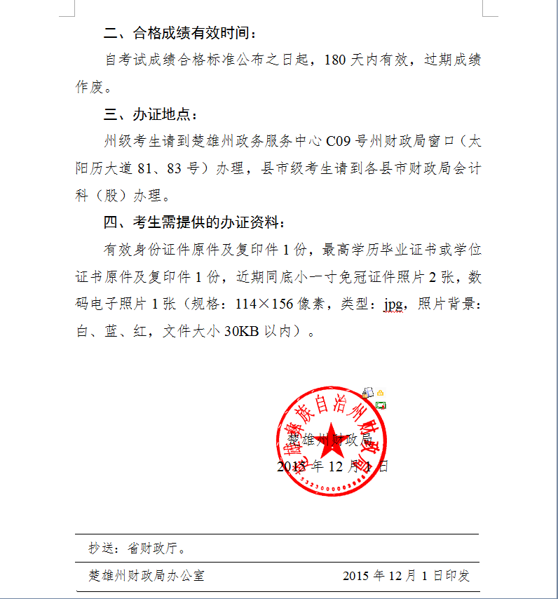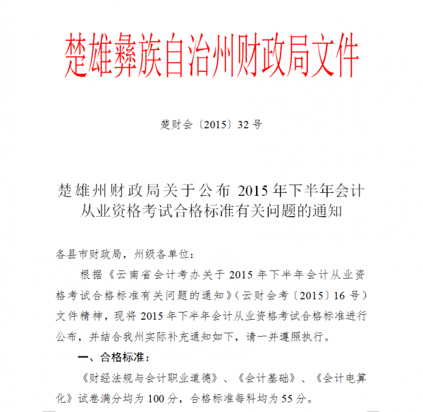 楚雄州2015年下半年會(huì)計(jì)從業(yè)資格考試合格標(biāo)準(zhǔn)通知