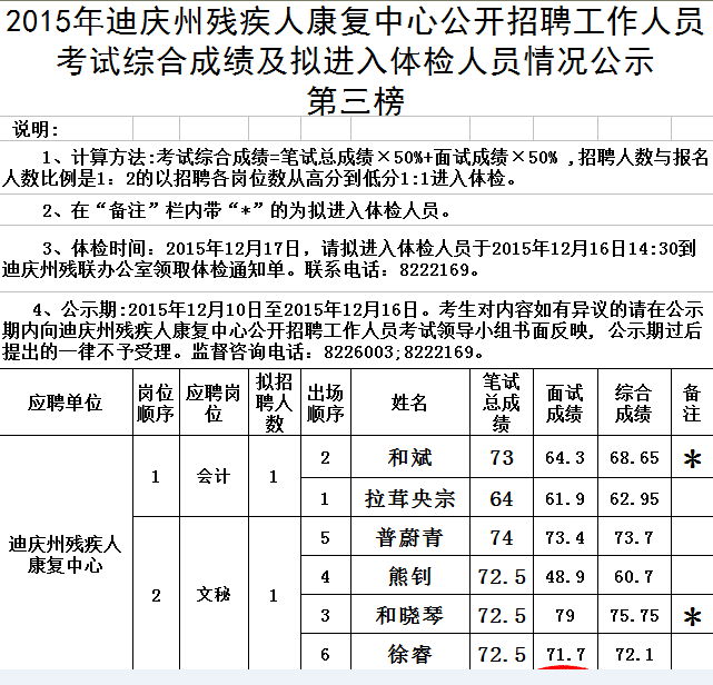 2015年迪慶州殘疾人康復中心招聘人員綜合成績及體檢人員公示