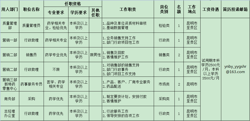 營銷三部新特藥零售中心藥事服務(wù)專員工作地點為昆明市,其他崗位工作地點均為昆明市呈貢區(qū)。