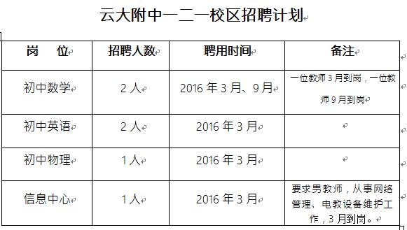 為適應學校發(fā)展的需要,云南大學附屬中學一二一校區(qū)現(xiàn)面向全國招聘初中部分學科優(yōu)秀教師(具體招聘計劃見附表)。