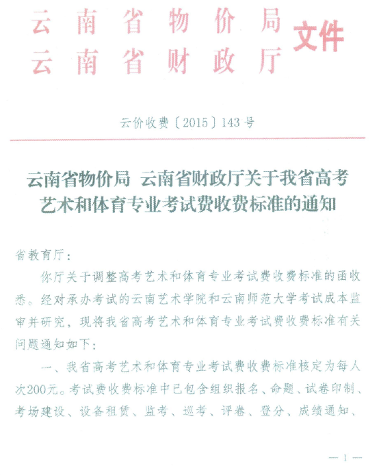 根據(jù)云南省物價(jià)局、云南省財(cái)政廳云價(jià)收費(fèi)[2015]143號(hào)文件, 2016年藝術(shù)類、體育類專業(yè)統(tǒng)考收費(fèi)標(biāo)準(zhǔn)調(diào)整為每人次200元,特此通知。