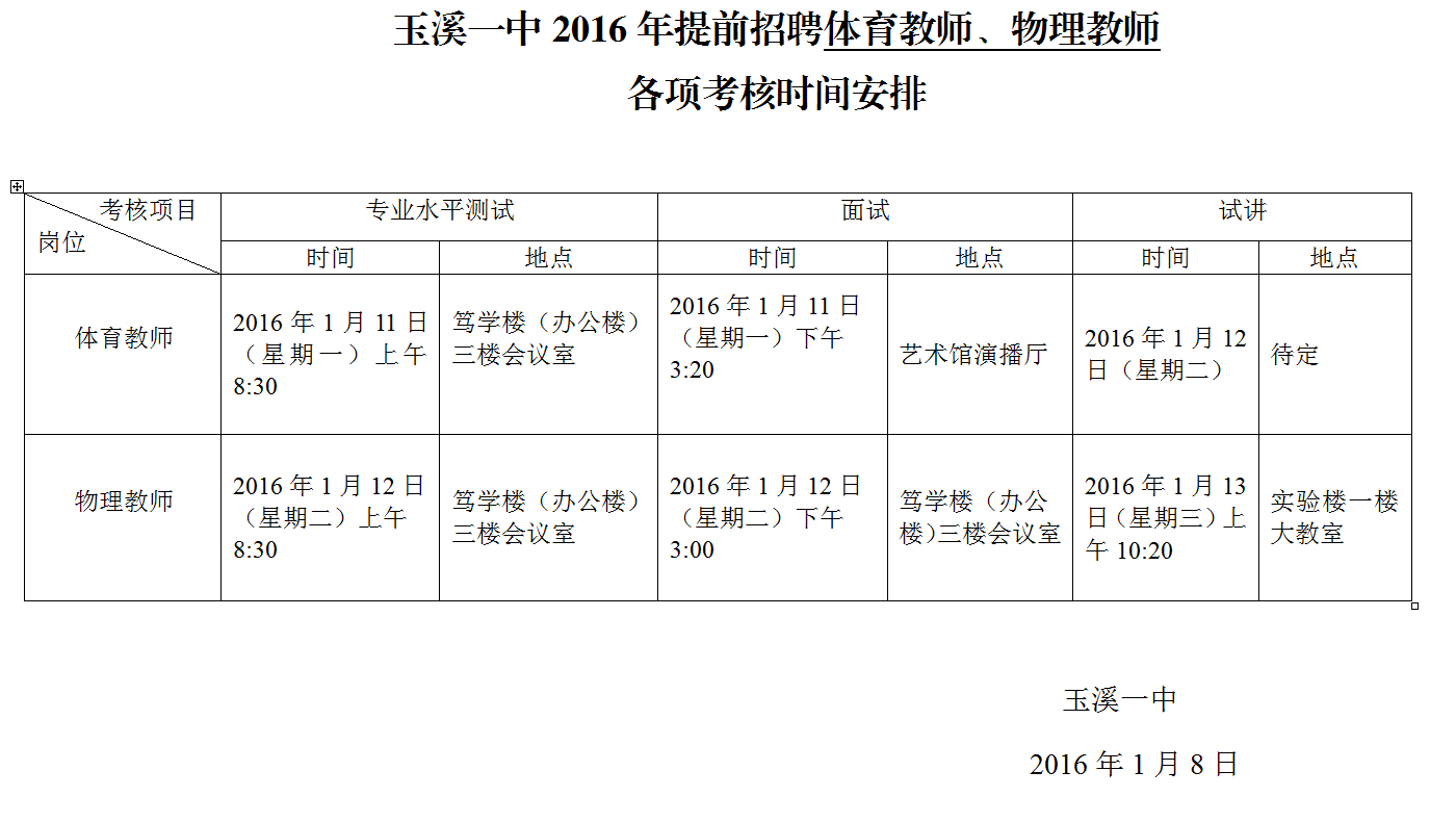 玉溪一中2016年提前招聘體育教師、物理教師各項考核時間安排