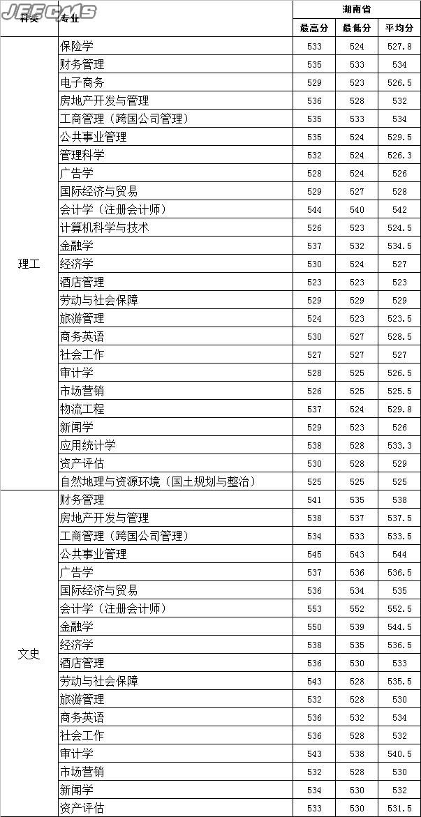 云南財經(jīng)大學2015年湖南省錄取情況一覽表