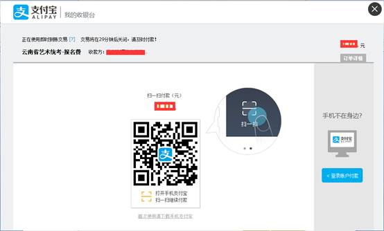 提交成功后進(jìn)入“專(zhuān)業(yè)交費(fèi)”頁(yè)面,點(diǎn)擊“支付”按鈕,系統(tǒng)會(huì)打開(kāi)支付寶支付頁(yè)面,考生在支付寶平臺(tái)交費(fèi)成功后,調(diào)回到“藝考報(bào)名交費(fèi)平臺(tái)”后會(huì)顯示“支付成功”。