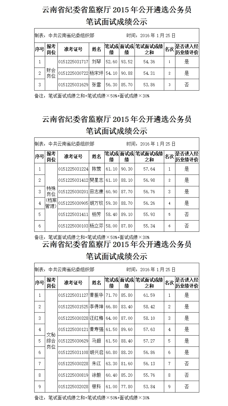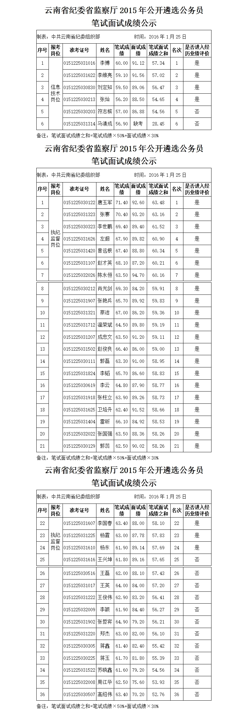 云南省紀(jì)委省監(jiān)察廳2015年公開遴選公務(wù)員筆試面試成績公示