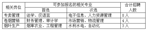 專賣管理崗位8人、卷煙營銷崗位4人、煙葉生產(chǎn)崗位3人,合計(jì)招聘15人。