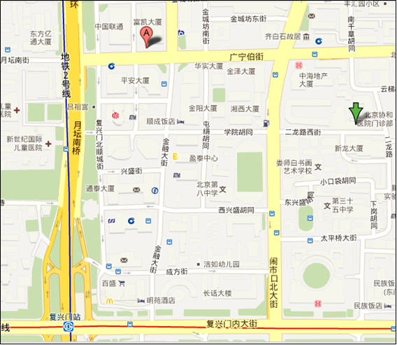 (一)飛機(jī):乘坐機(jī)場(chǎng)大巴(機(jī)場(chǎng)-西單線)到西單站下車,換乘1號(hào)線地鐵或乘坐1路公共汽車至復(fù)興門站,向北500米。
