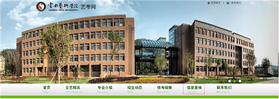 一、進(jìn)入云南藝術(shù)學(xué)院校園網(wǎng)(http://www.ynart.edu.cn/index.shtml),點(diǎn)擊首頁(yè)上方導(dǎo)航條中“藝考網(wǎng)”鏈接,進(jìn)入藝考網(wǎng)首頁(yè)。