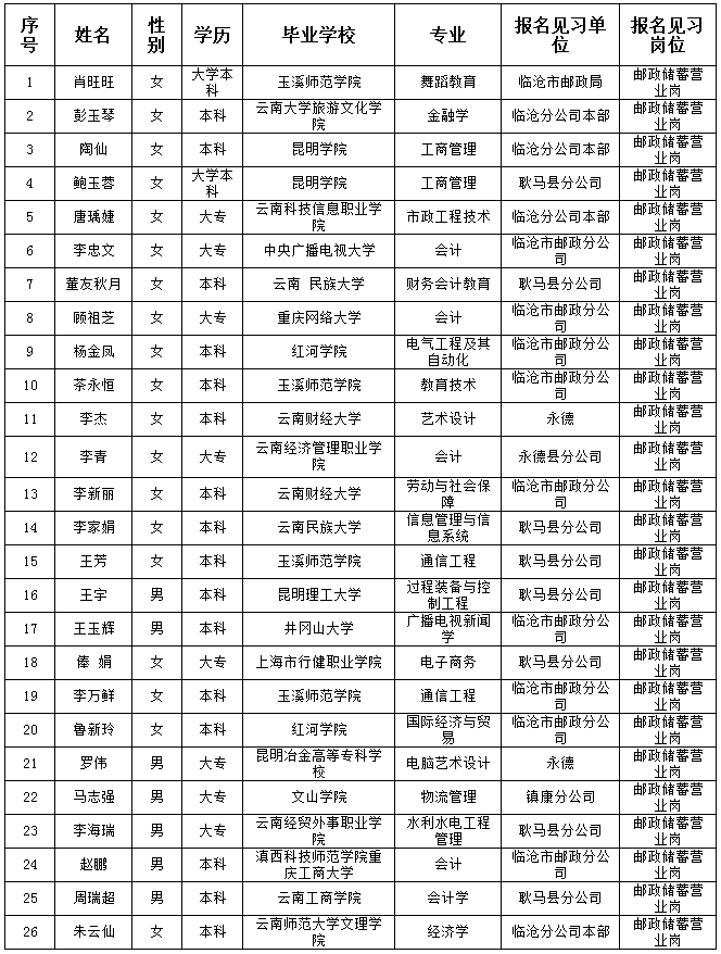 (二)報(bào)到地點(diǎn):臨滄市南塘街132號(hào)臨滄市郵政分公司人力資源部。